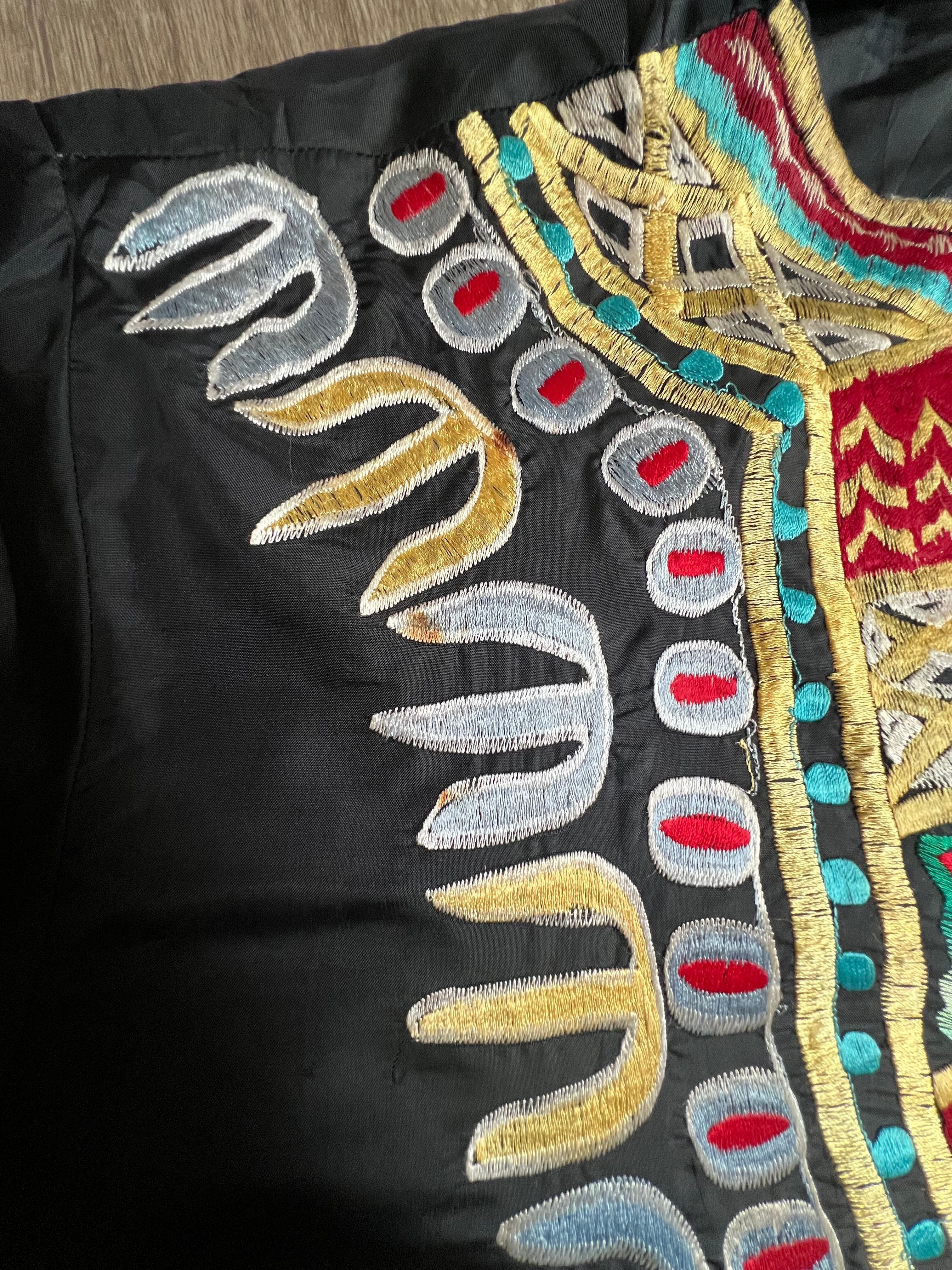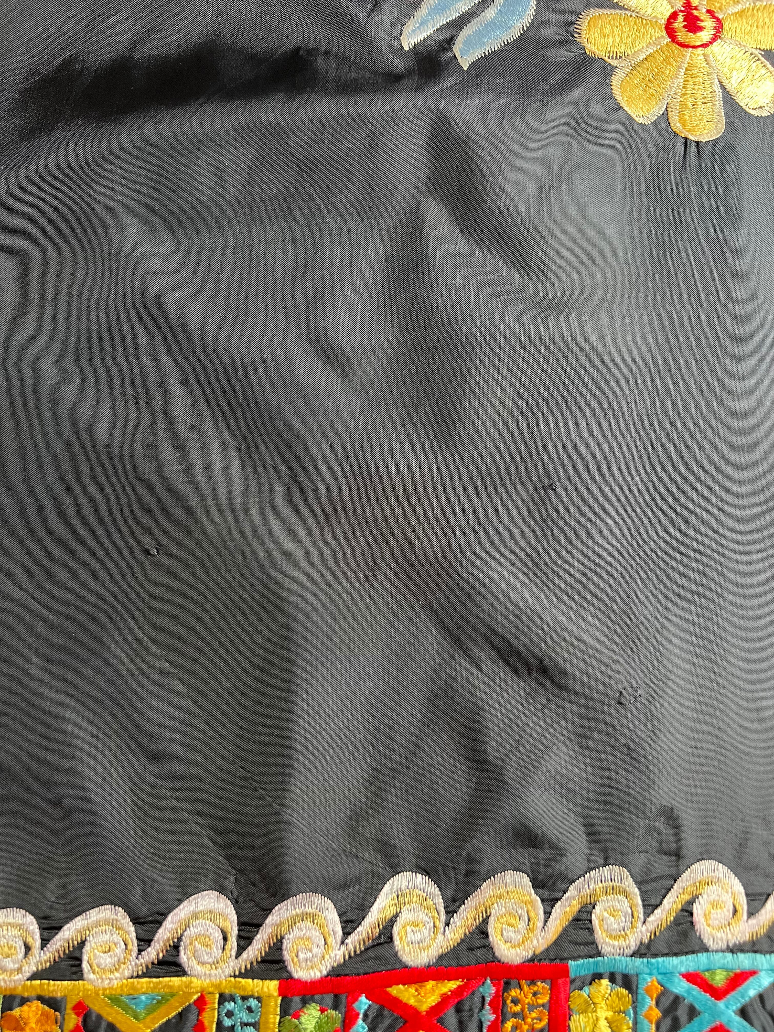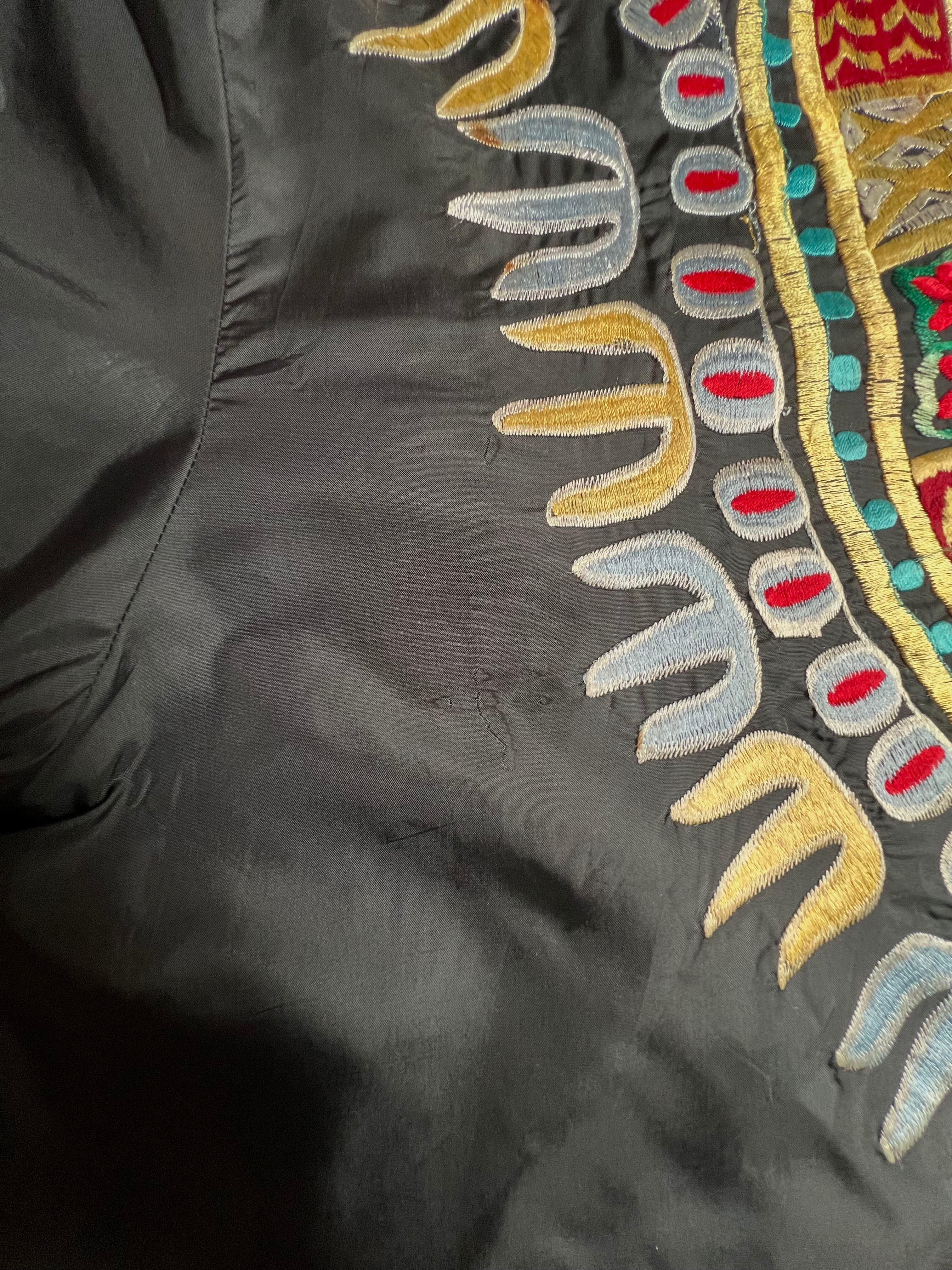 特筆するダメージとして刺繍部分にシミやほつれがございます。ブラックの生地にシワのような何かの形の跡の様なものがございます。またvintage特有の使用感はございます。