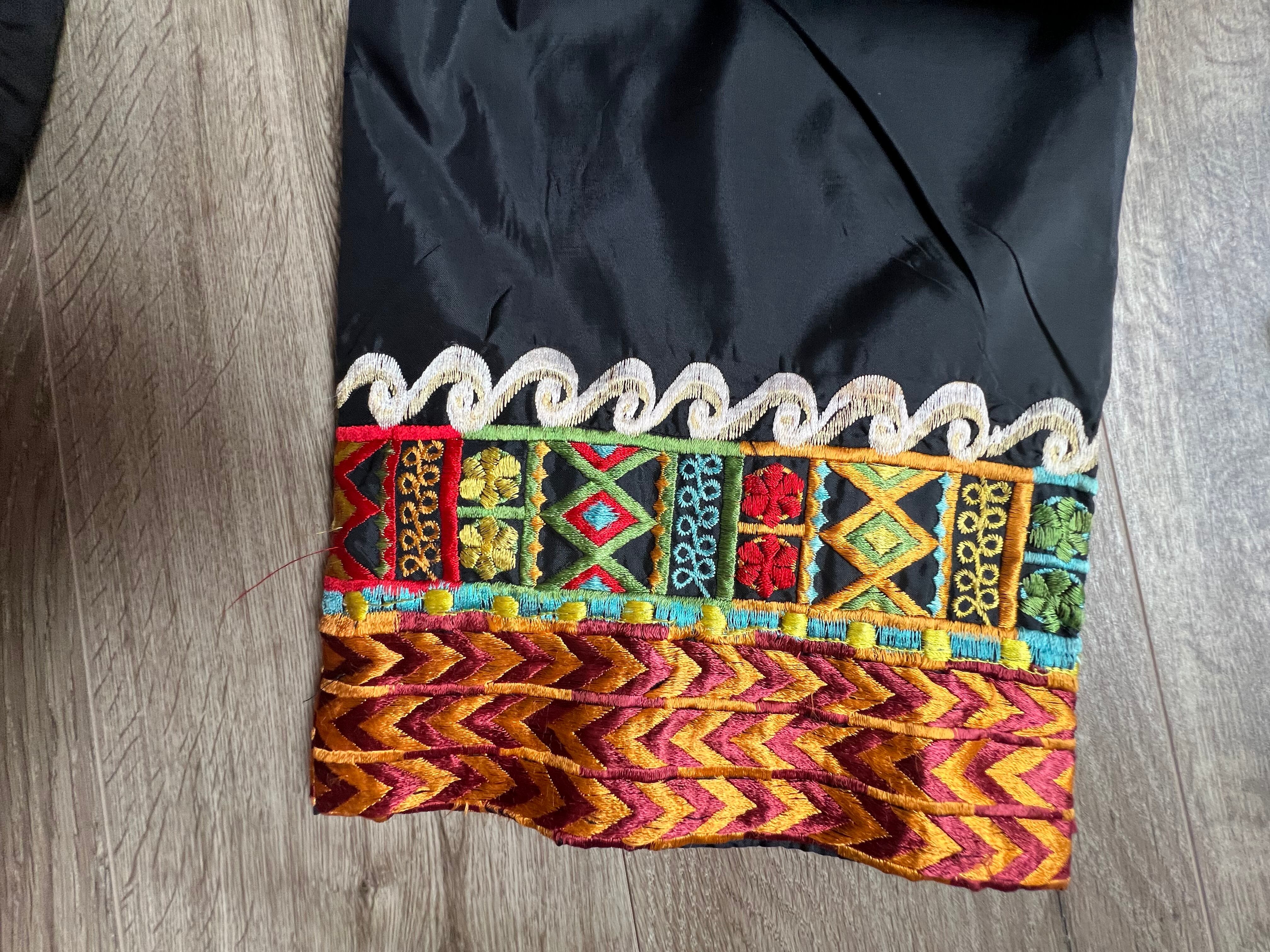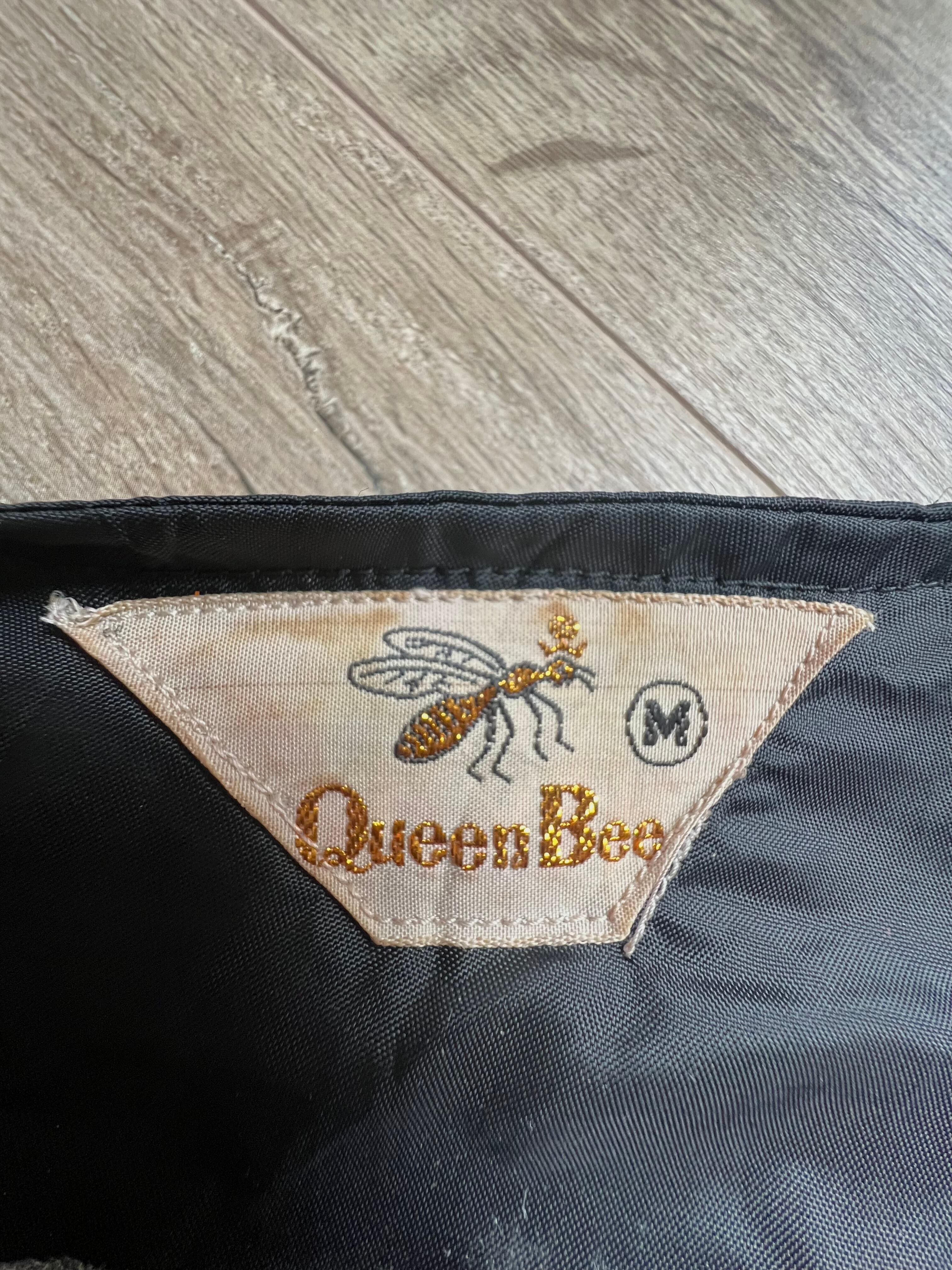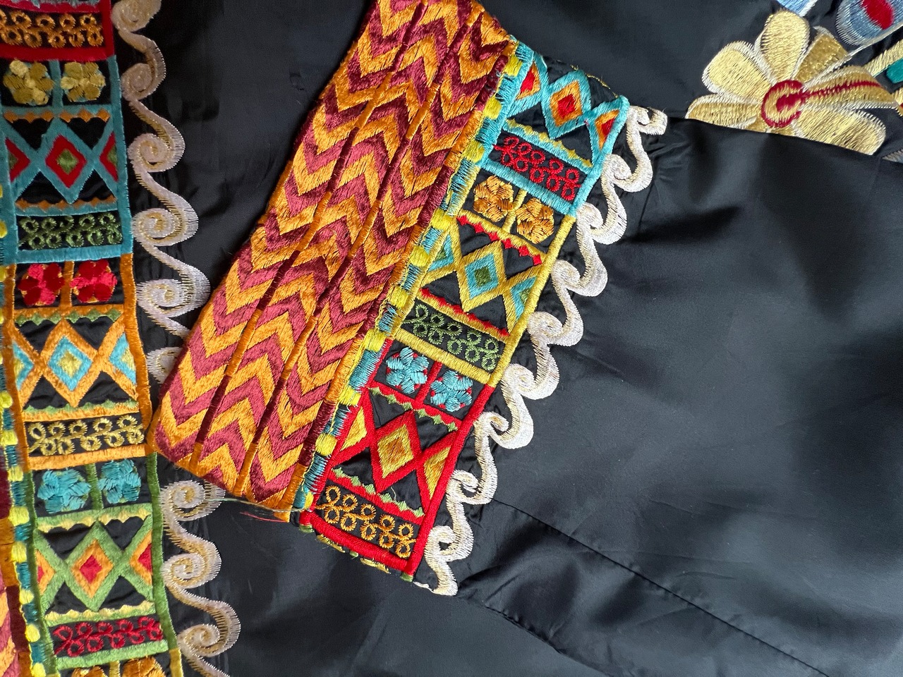 特筆するダメージとして刺繍部分にシミやほつれがございます。ブラックの生地にシワのような何かの形の跡の様なものがございます。またvintage特有の使用感はございます。
