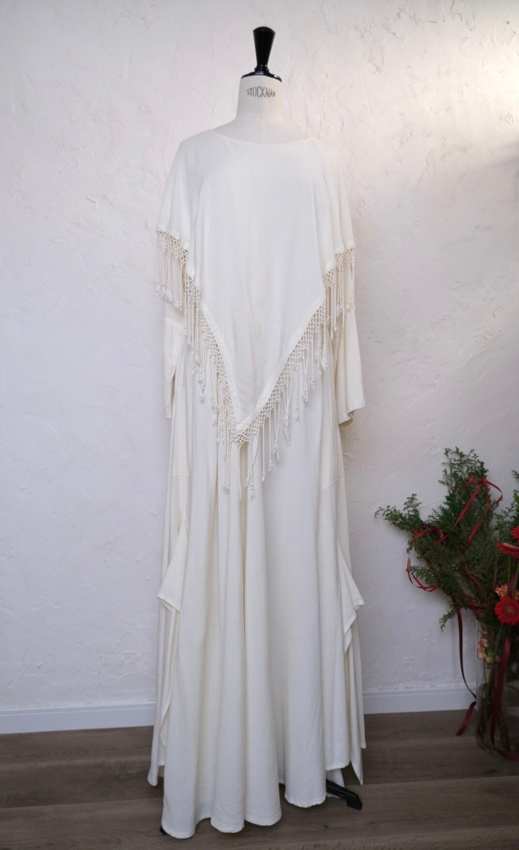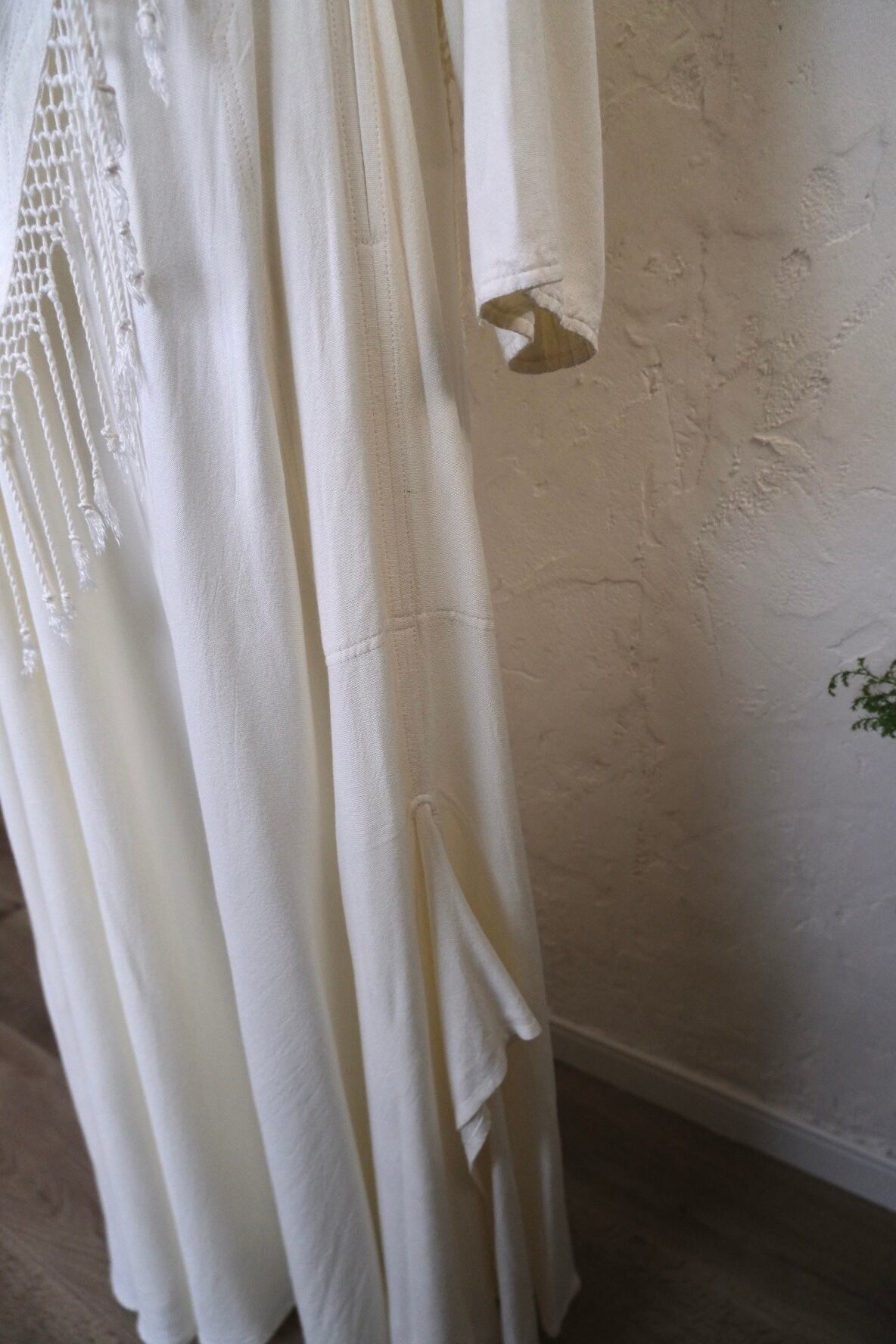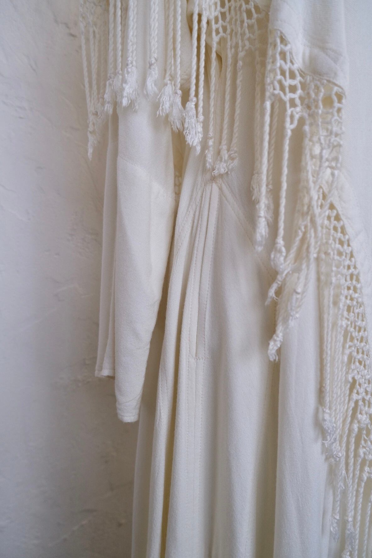 コットンレーヨンのお素材で真夏以外は着て頂けそう。ニットカーデなどを合わせてフリンジ部分を出すのも素敵かと思います。