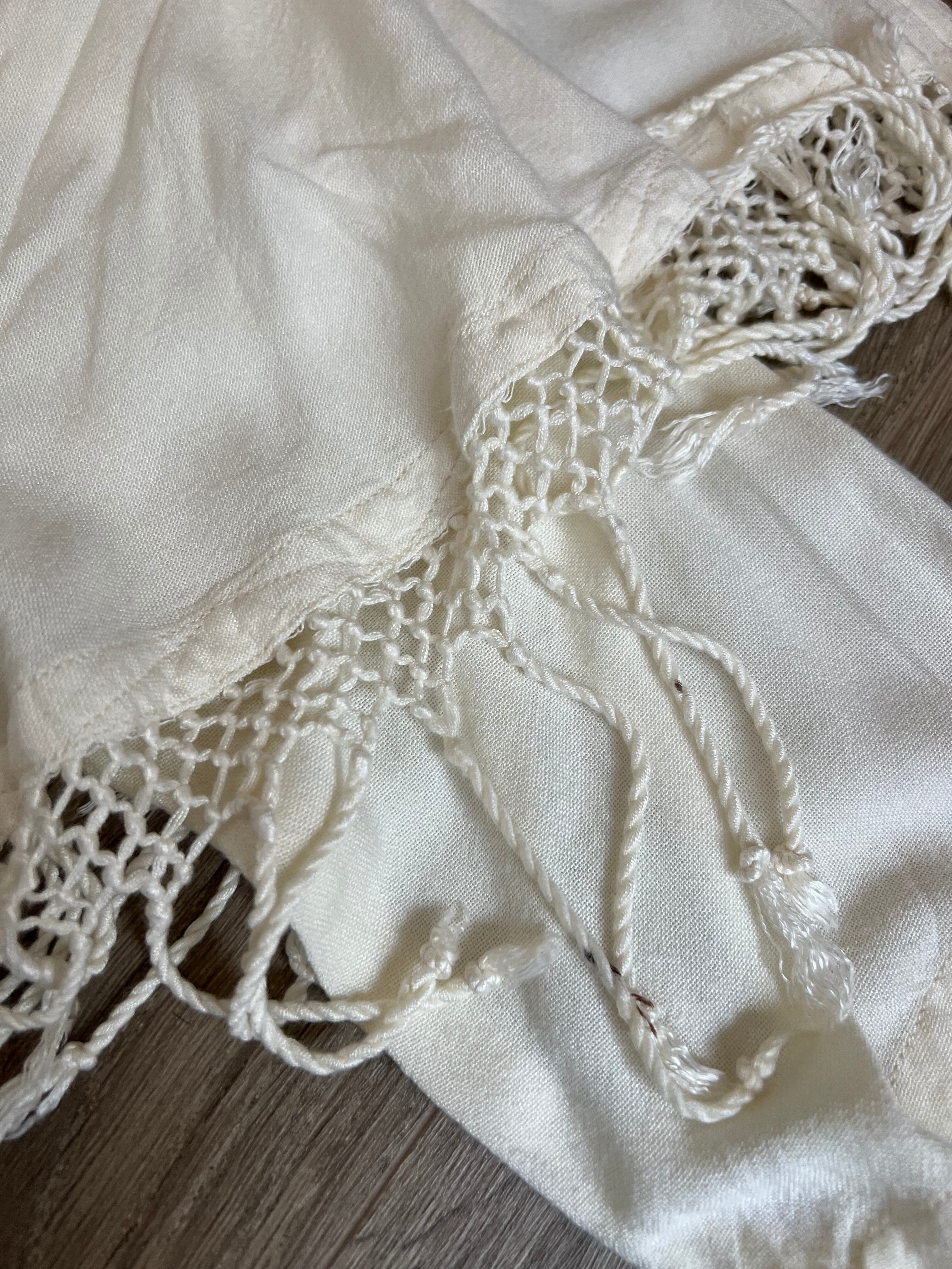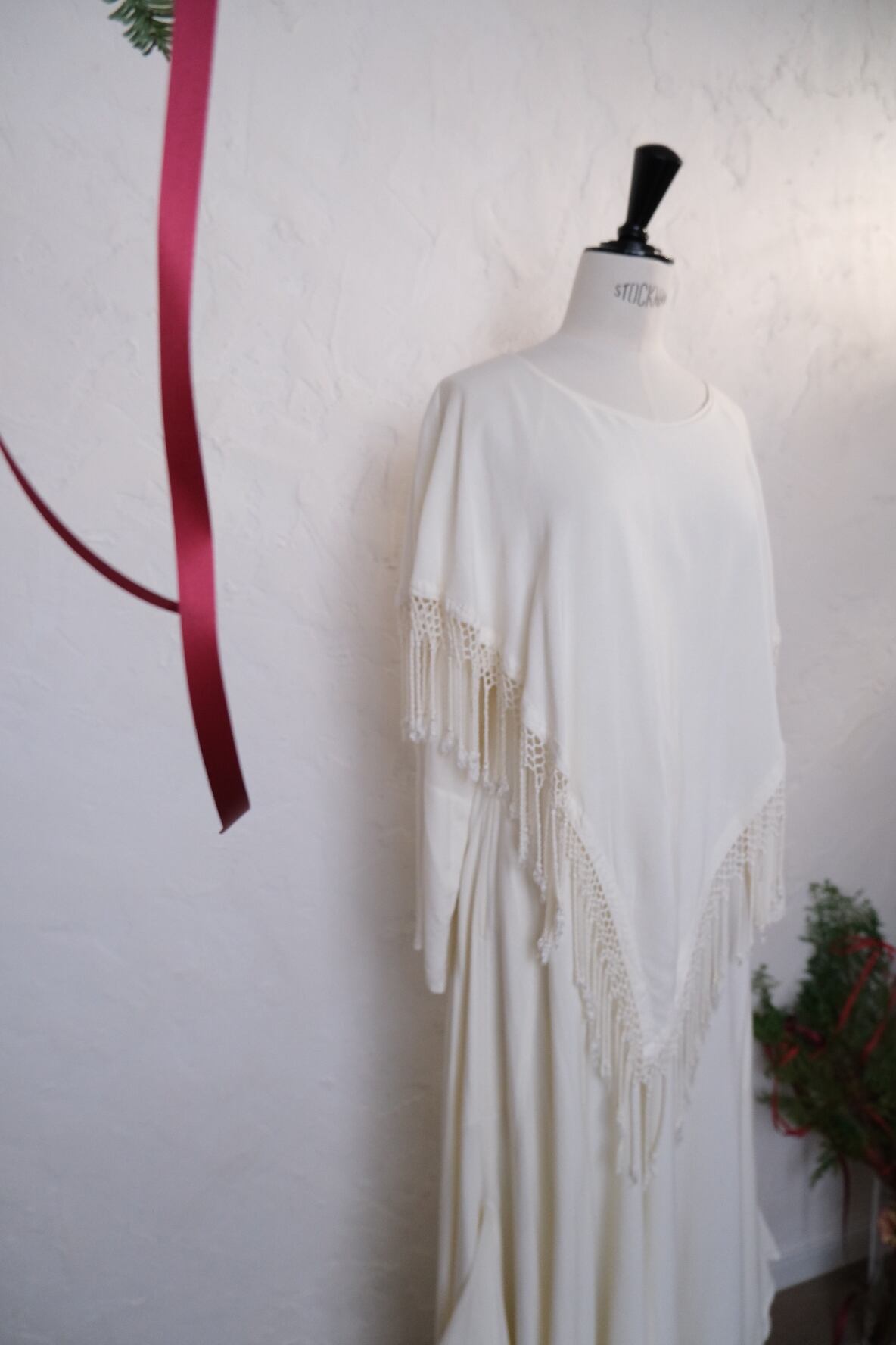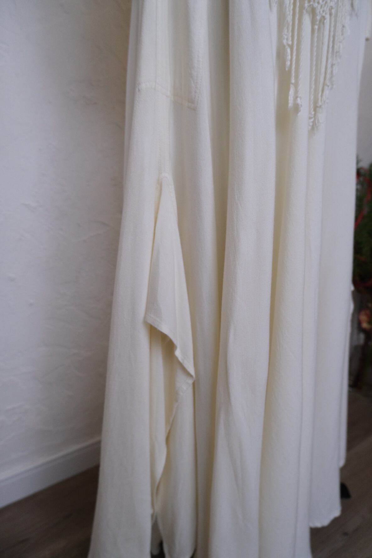 コットンレーヨンのお素材で真夏以外は着て頂けそう。ニットカーデなどを合わせてフリンジ部分を出すのも素敵かと思います。