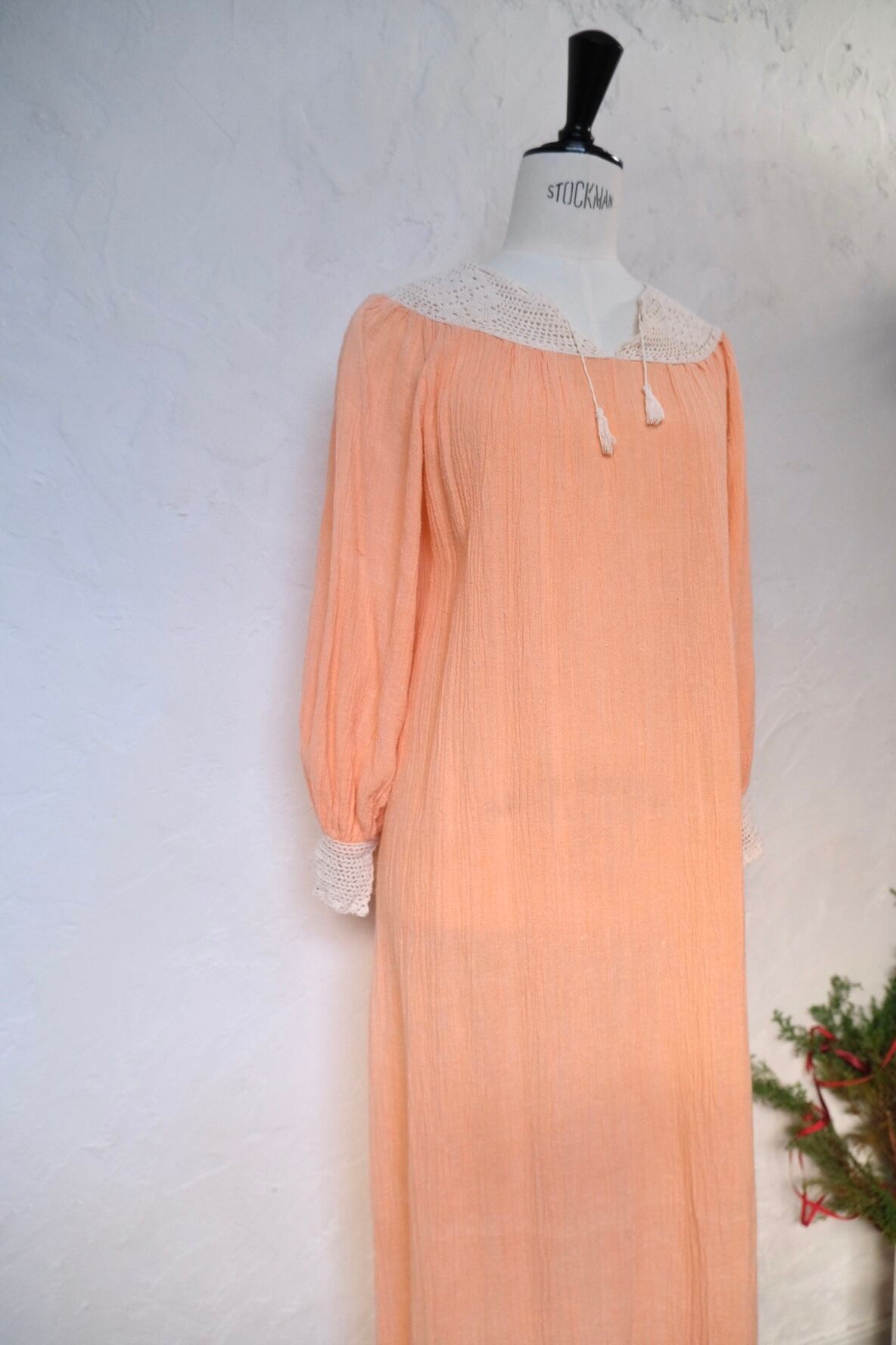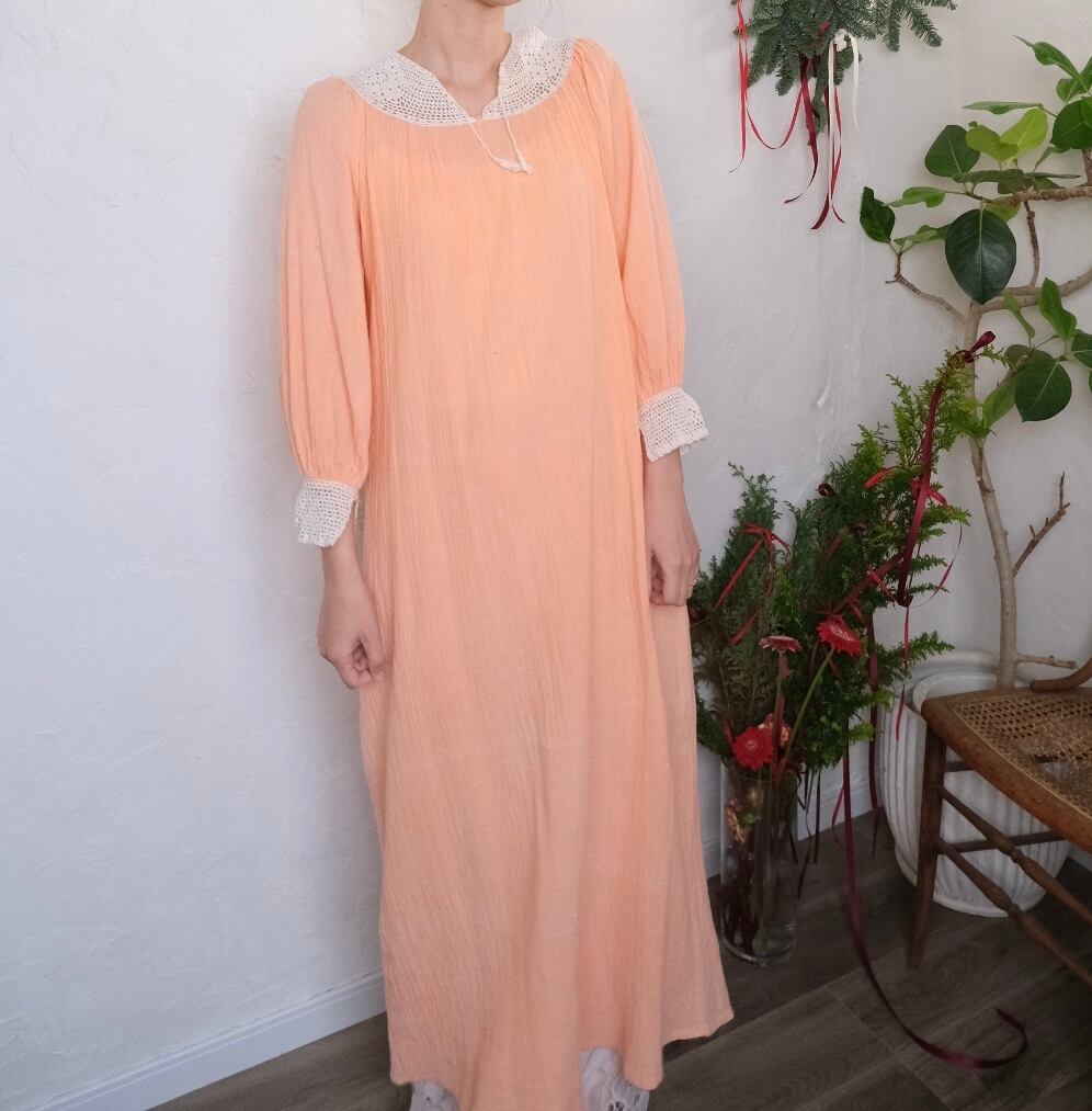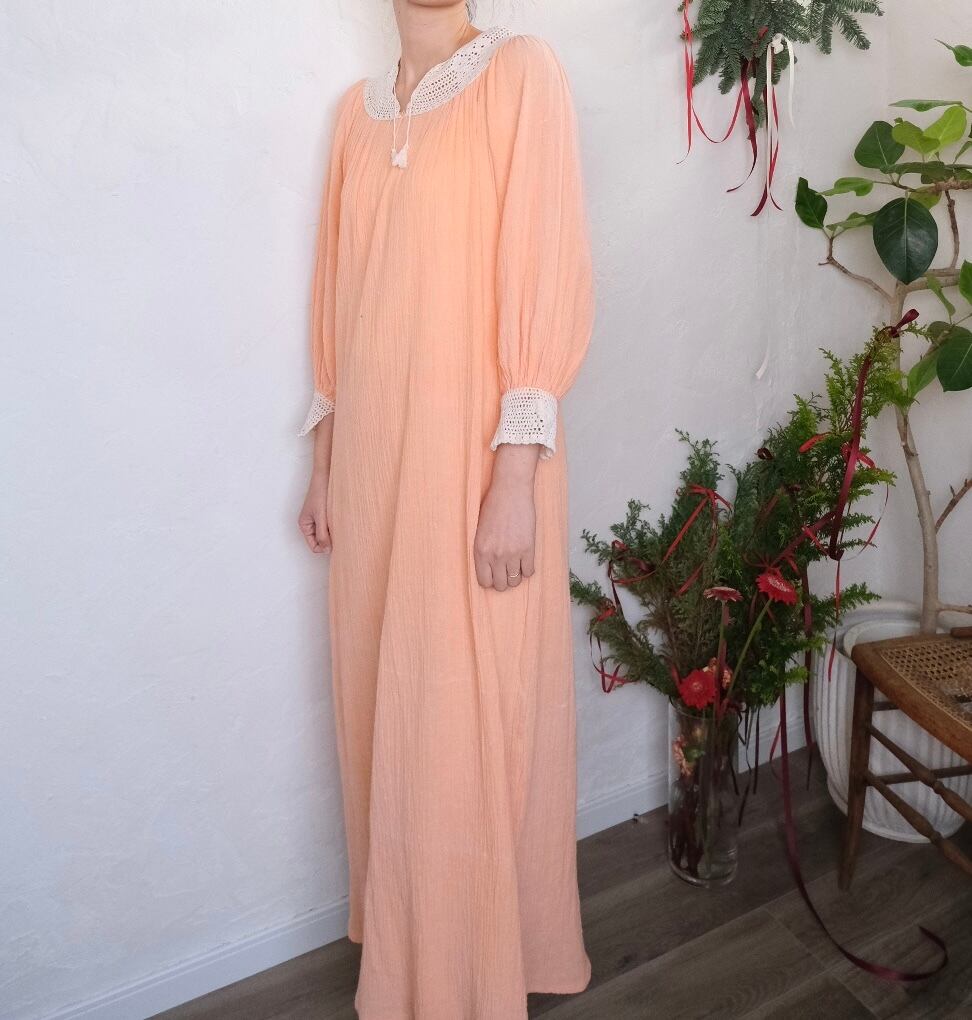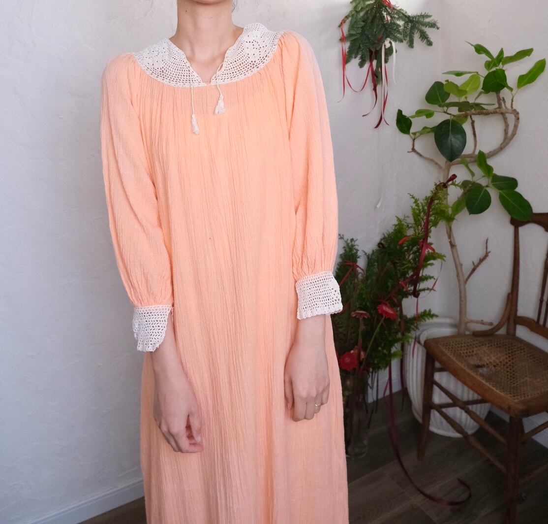 クロシェレースが素敵なサーモンピンクのロングドレス。肩周りスッキリ、袖のボリューム感も程よく甘過ぎない大人が着やすいvintage dress。
