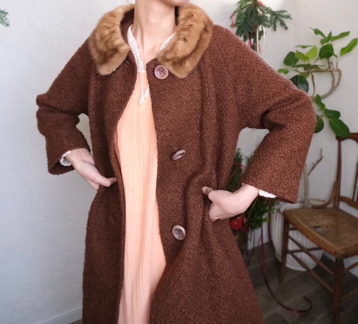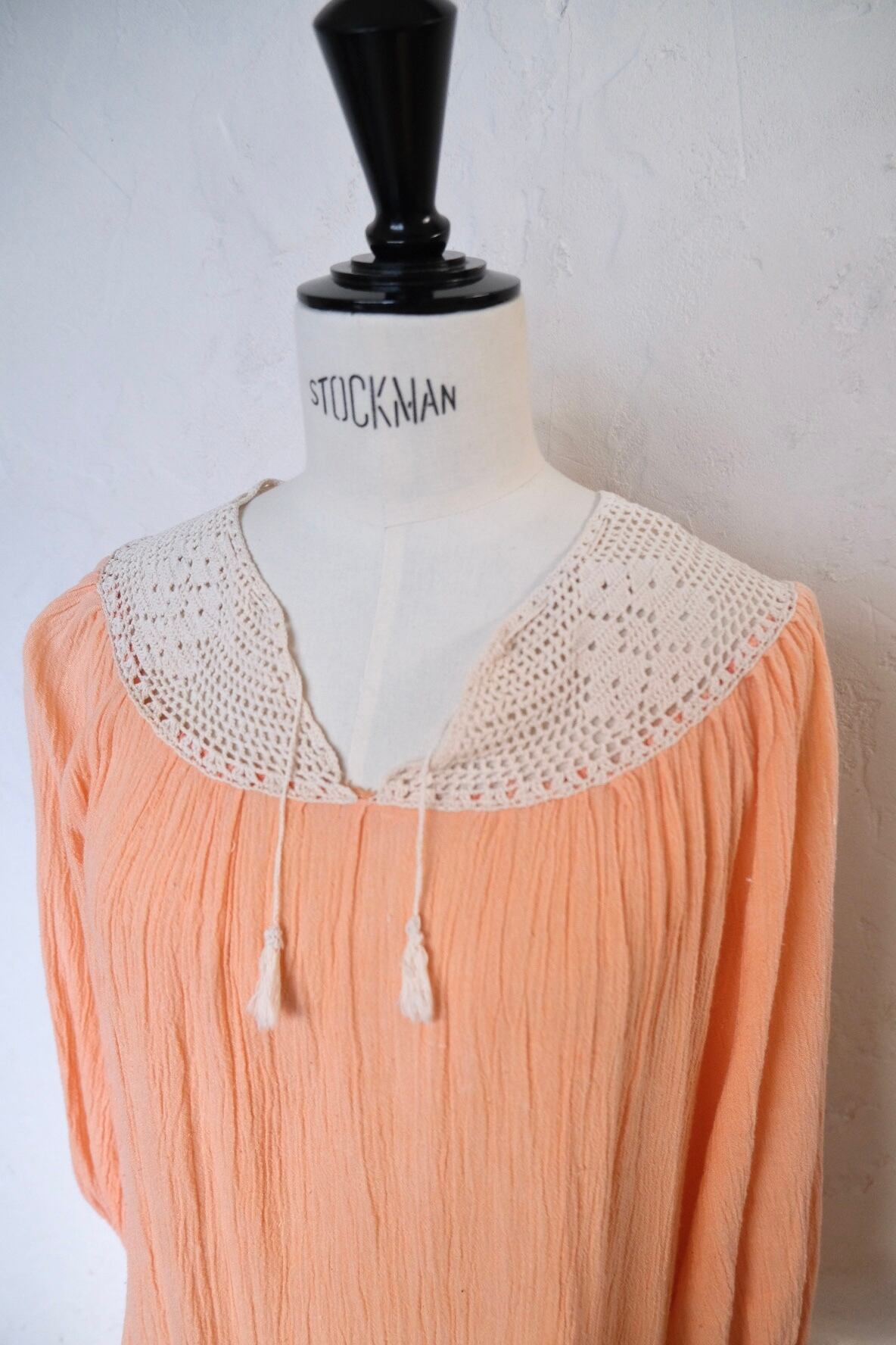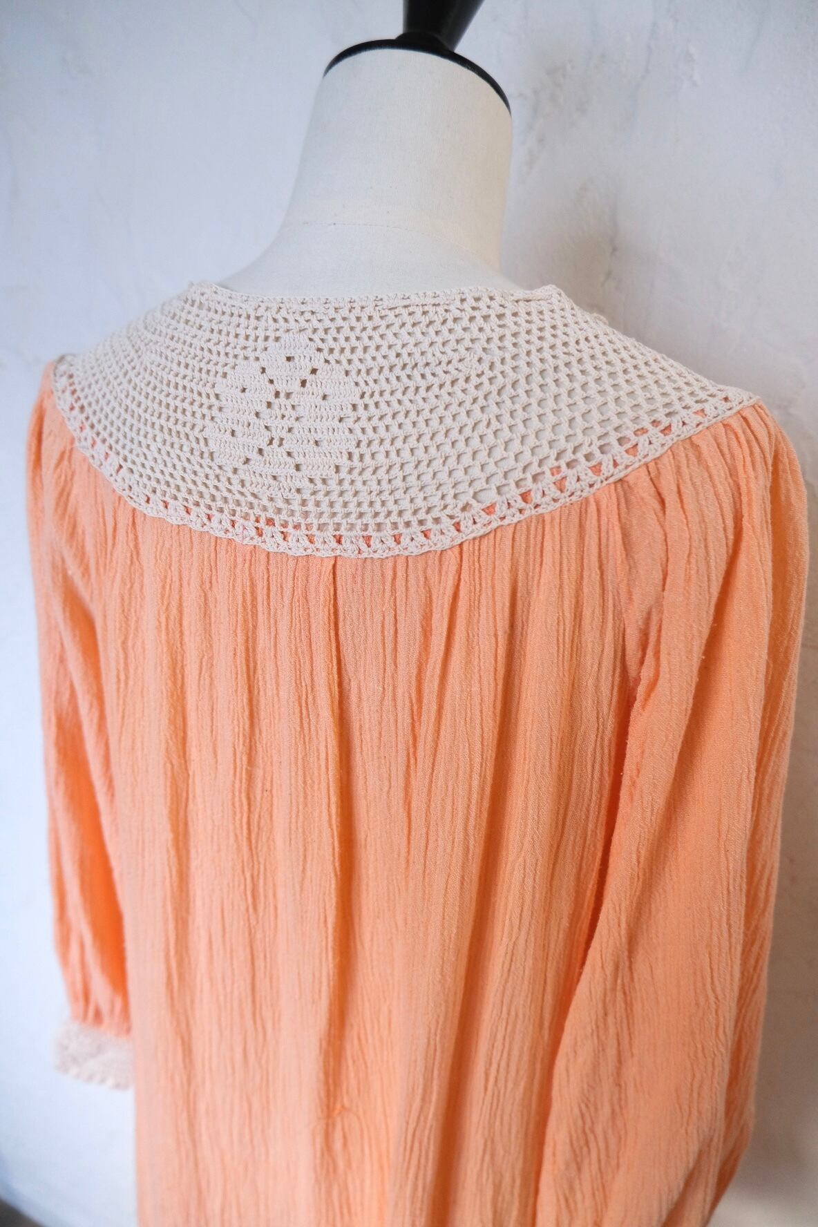 クロシェレースが素敵なサーモンピンクのロングドレス。肩周りスッキリ、袖のボリューム感も程よく甘過ぎない大人が着やすいvintage dress。