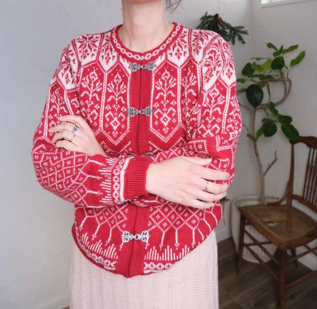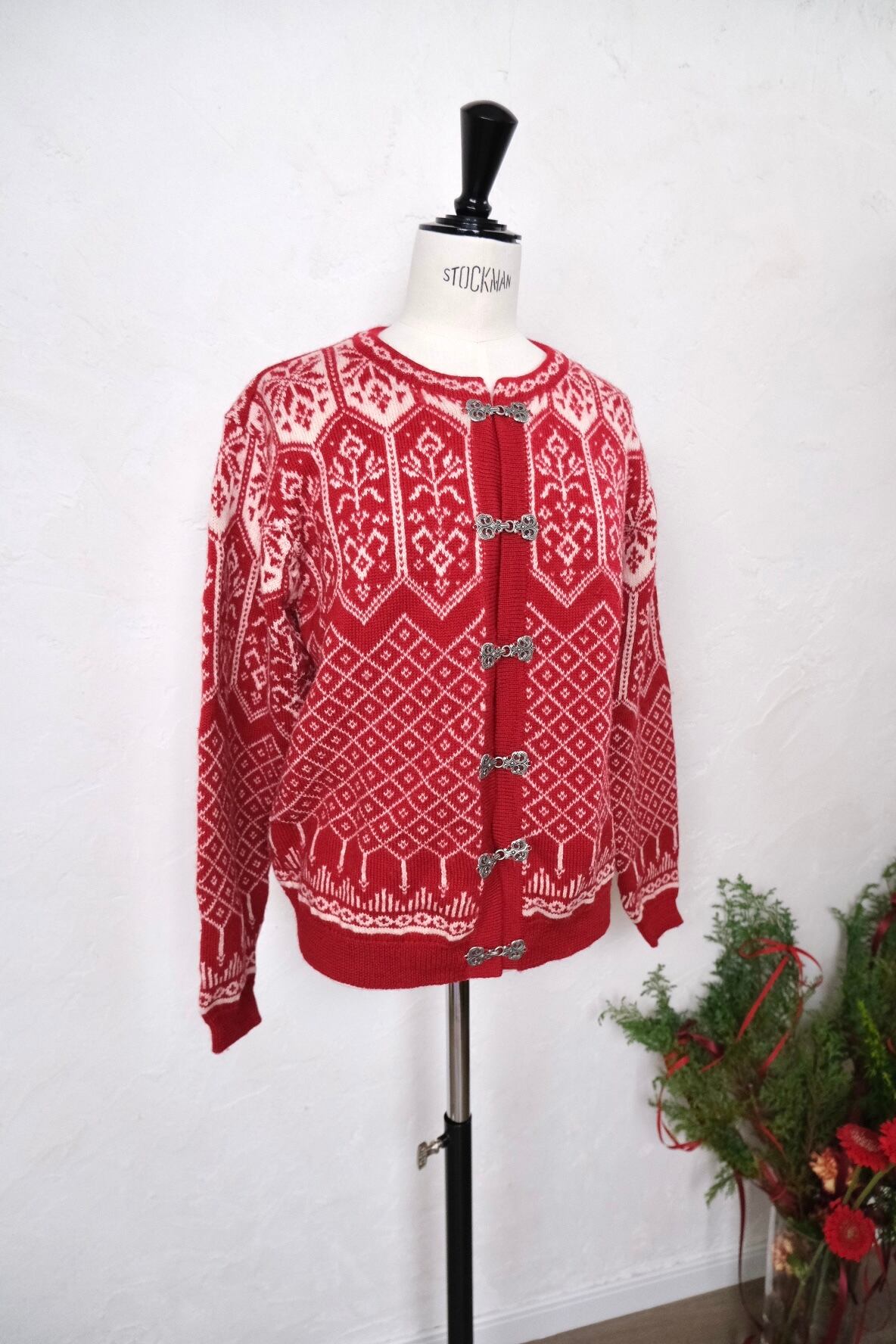 ホリディシーズンに着たくなる様な赤のノルディックカーディガン。