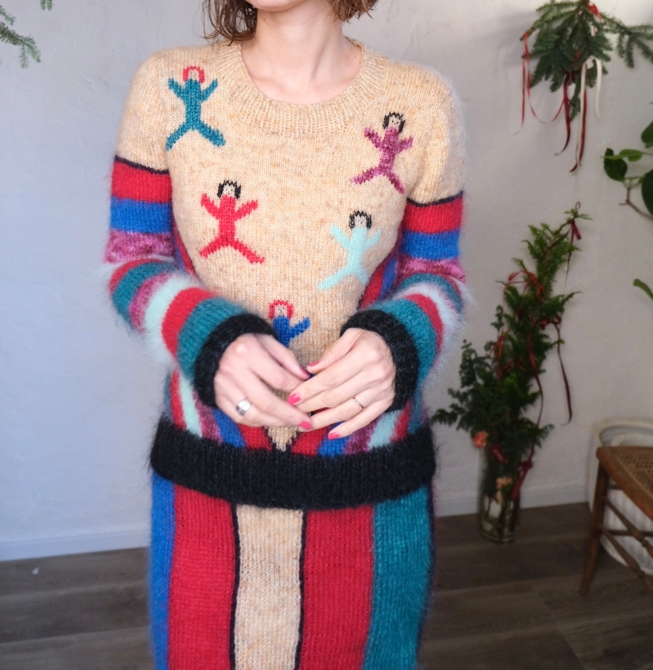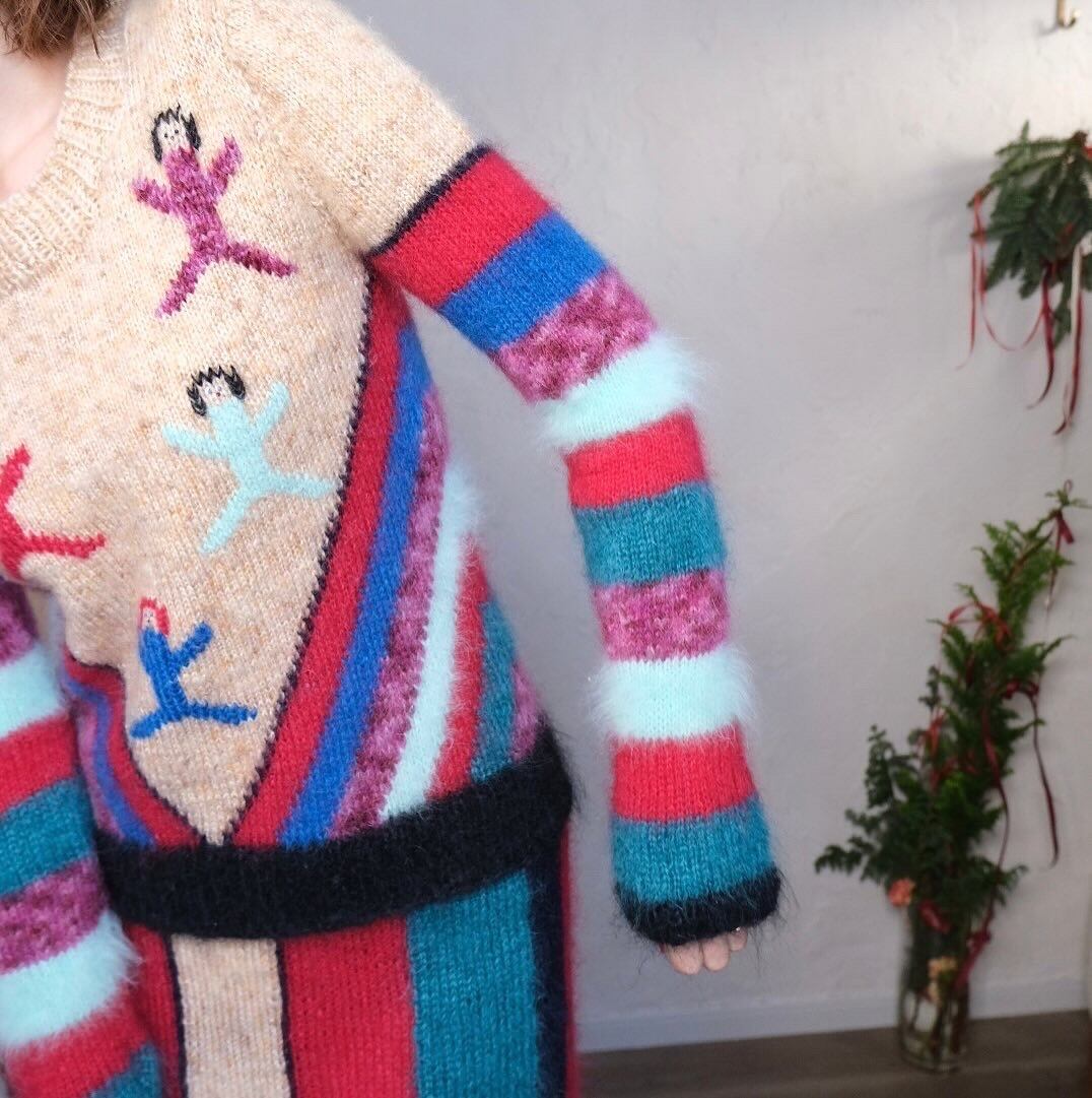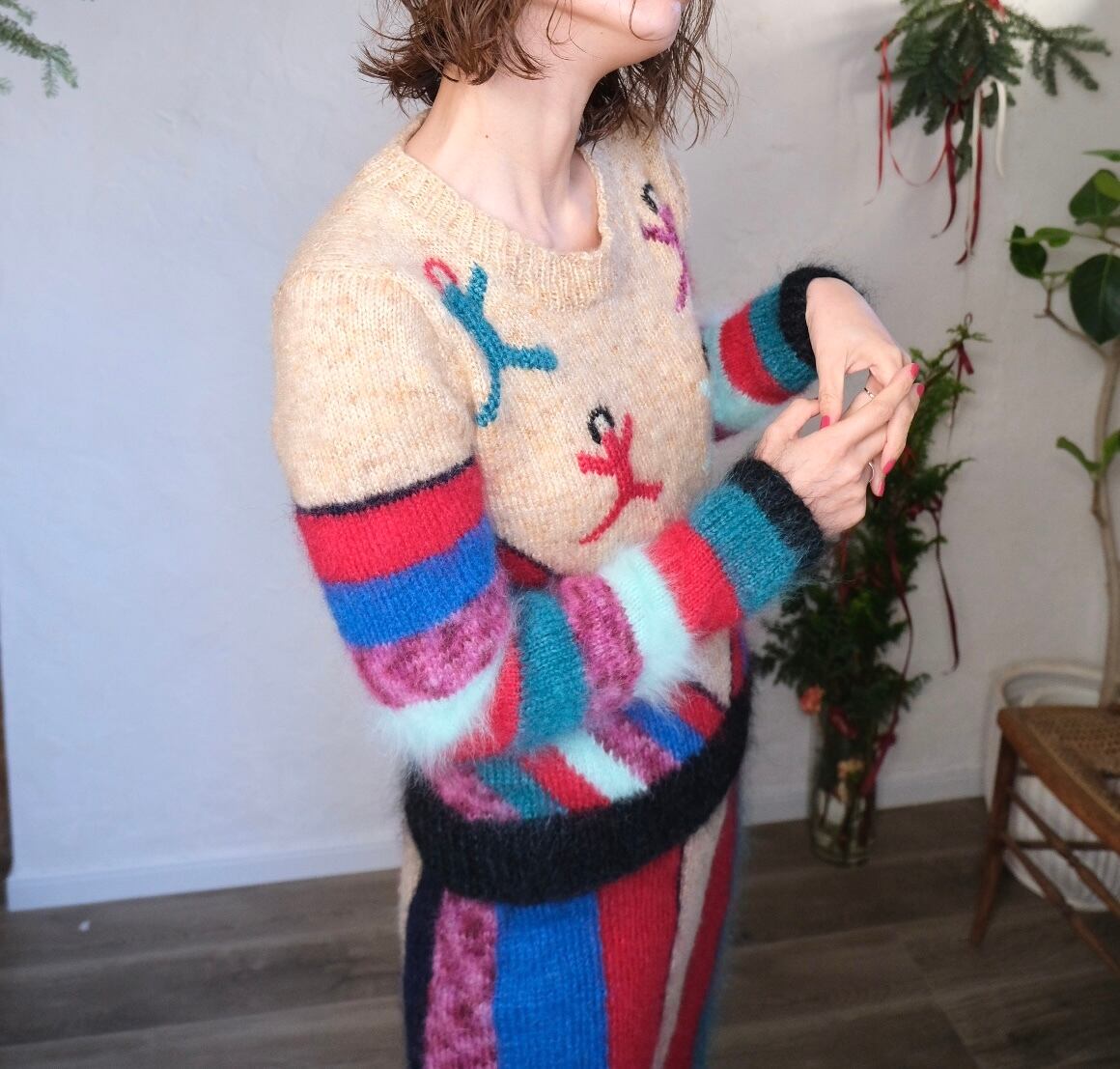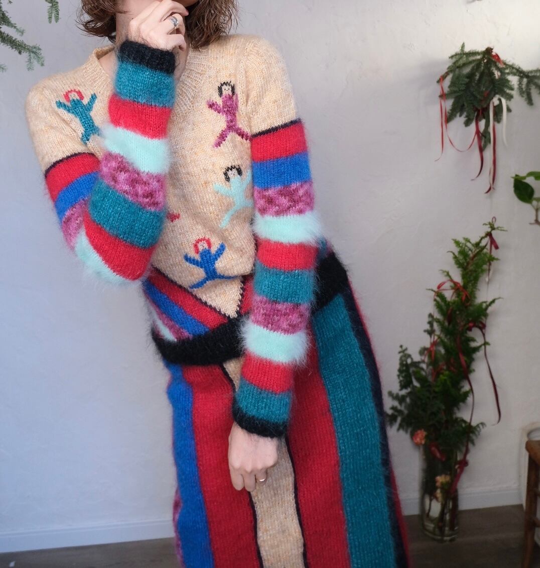 毛糸の種類もさまざまで、時折毛足の長いふわっとしたゾーンがあったり、ミックスヤーンで編まれていたりとてもデザイン性の高い一枚♡