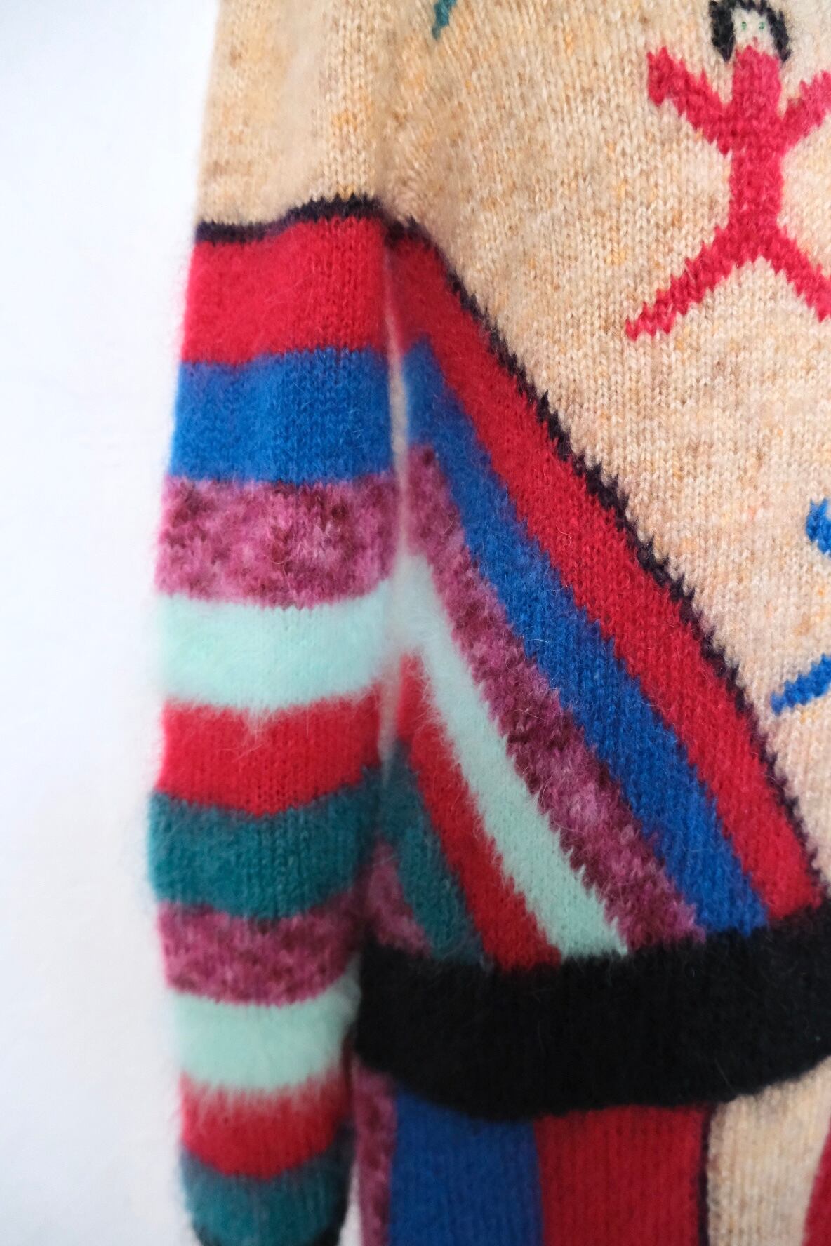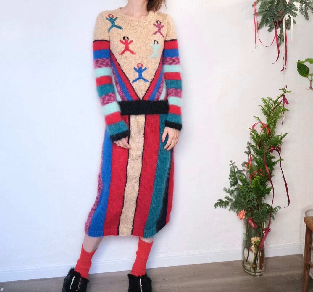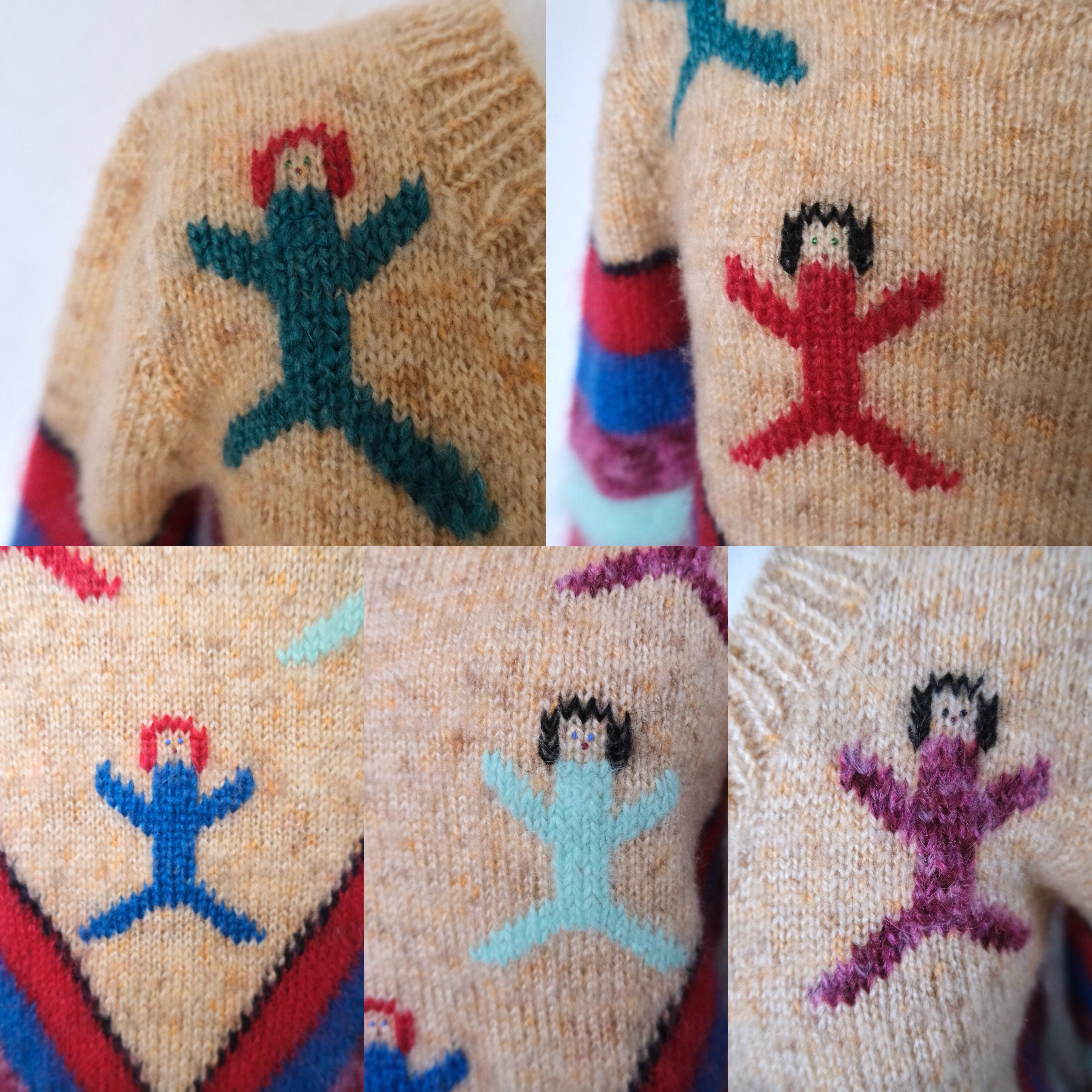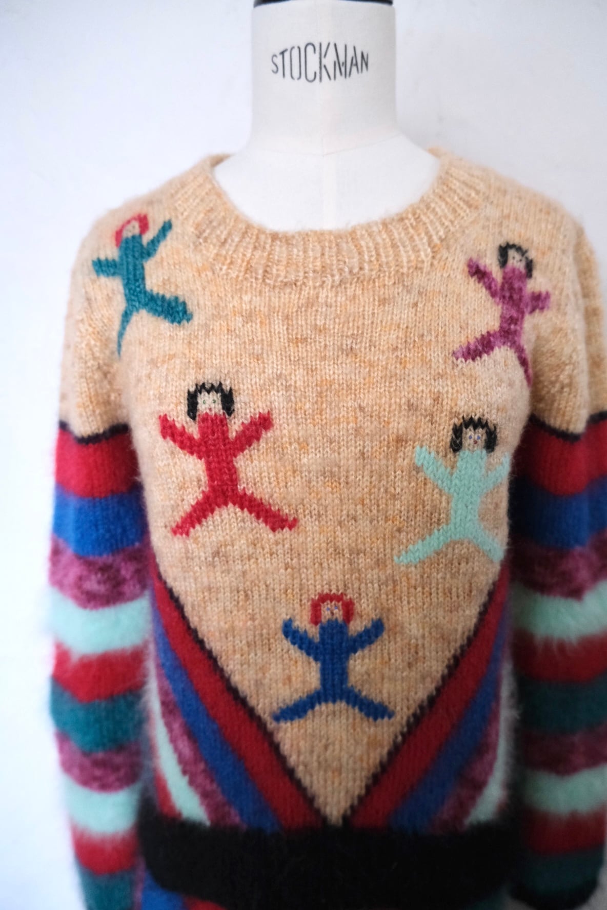 毛糸の種類もさまざまで、時折毛足の長いふわっとしたゾーンがあったり、ミックスヤーンで編まれていたりとてもデザイン性の高い一枚♡