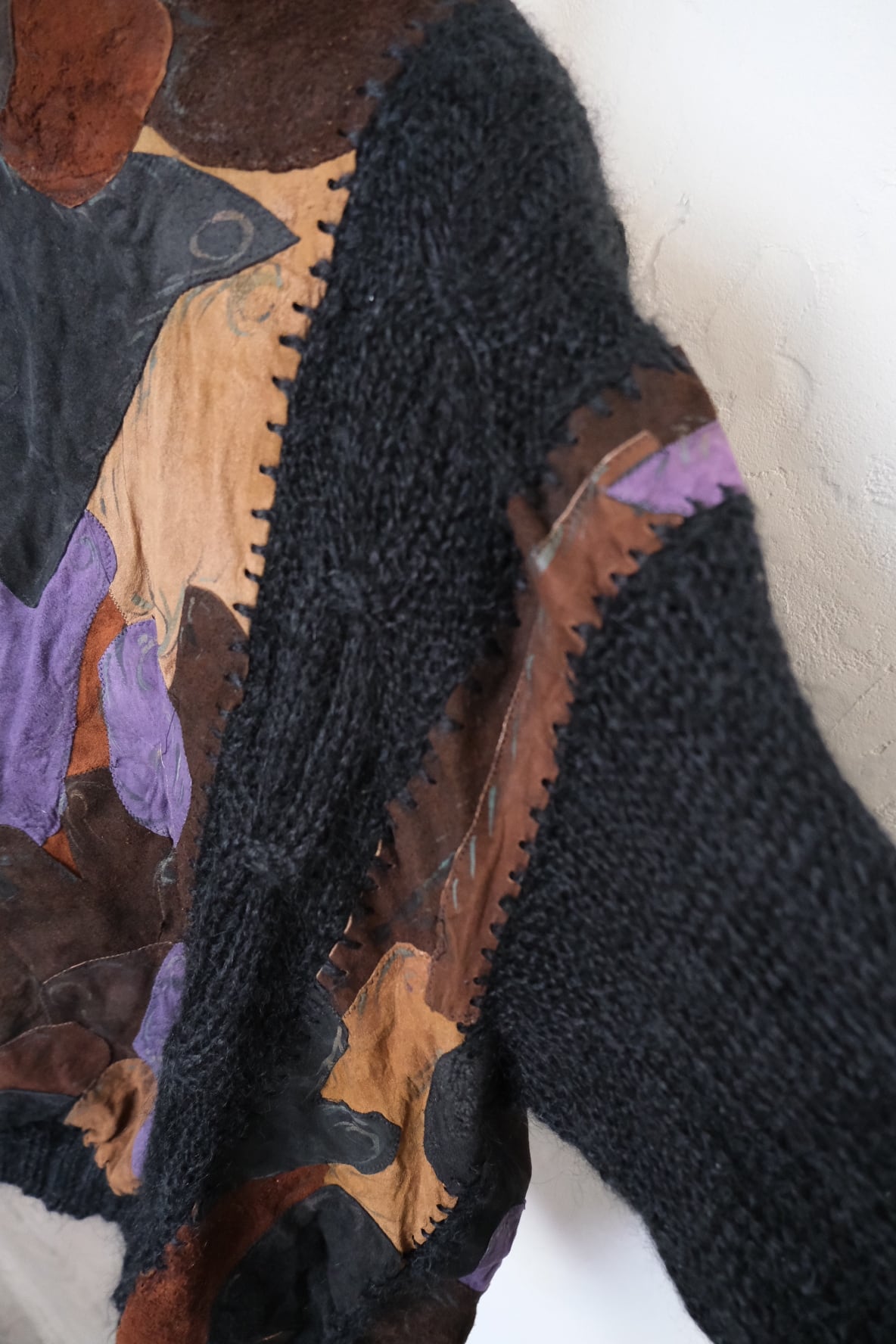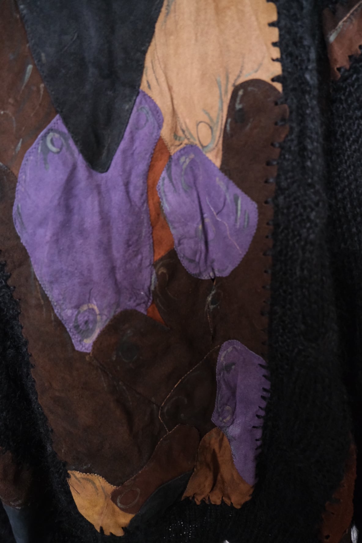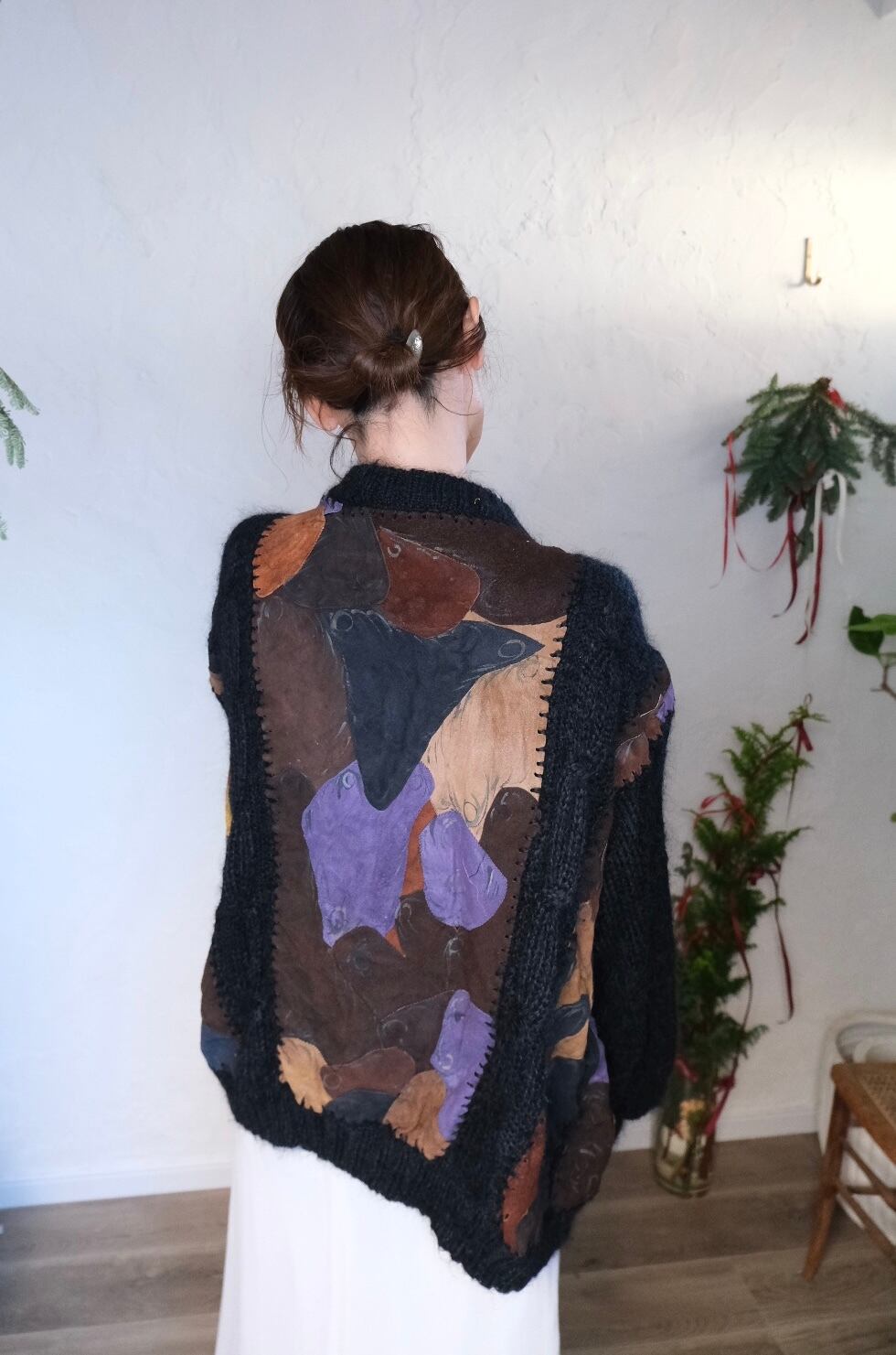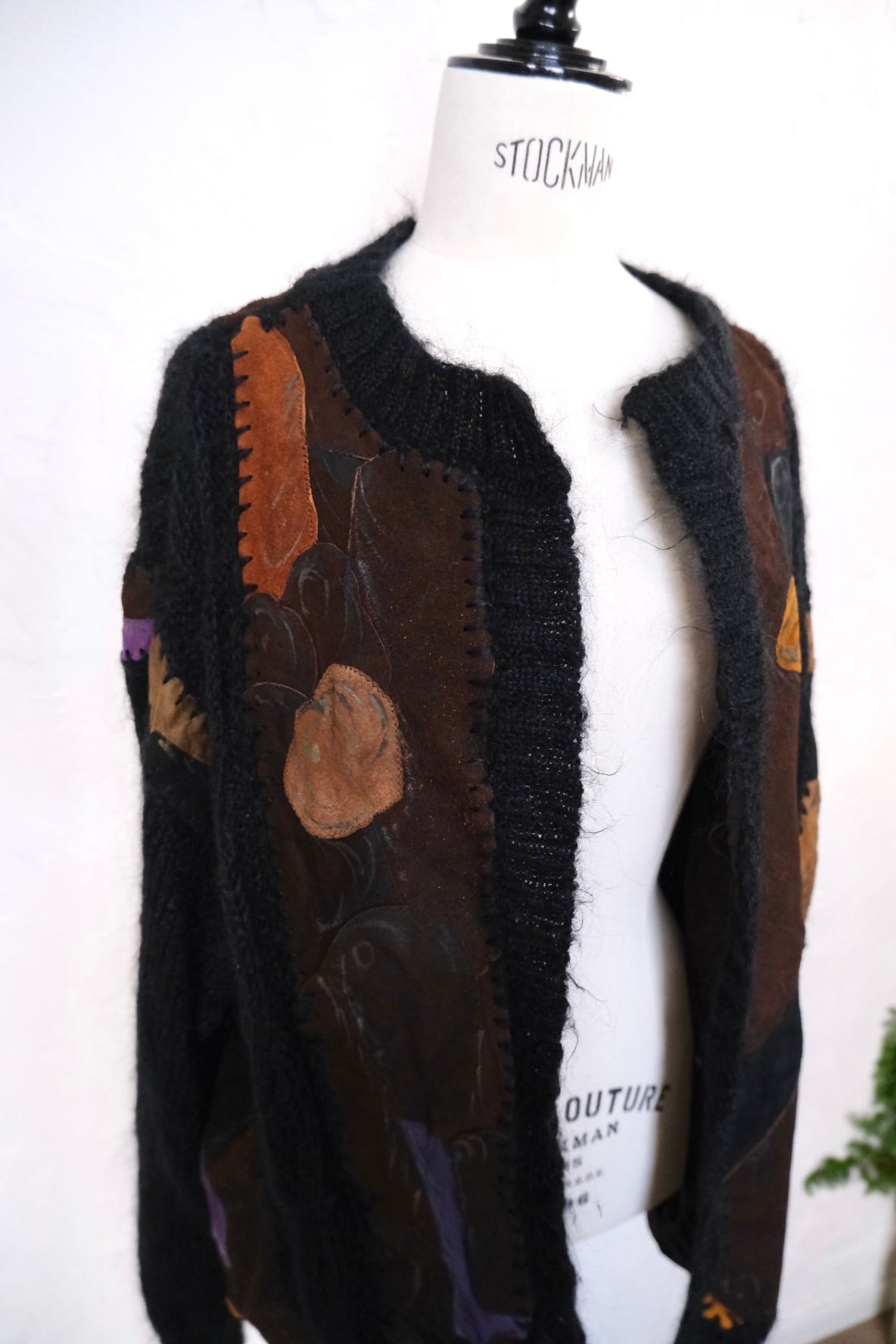 スゥエードのパッチワークの様なデザインが楽しいブラックモヘアカーディガン。