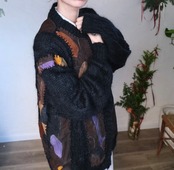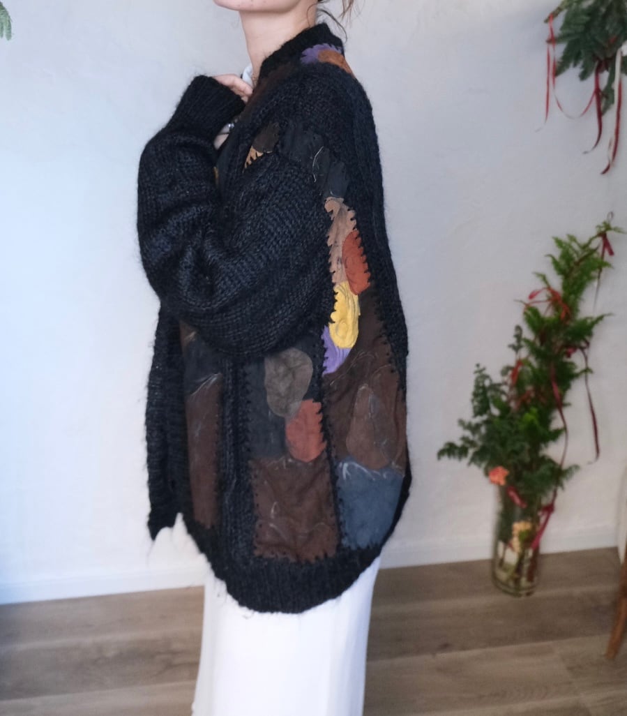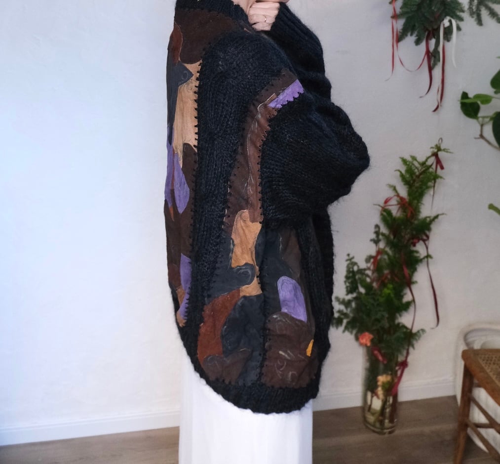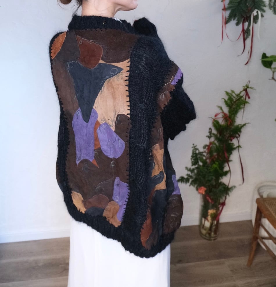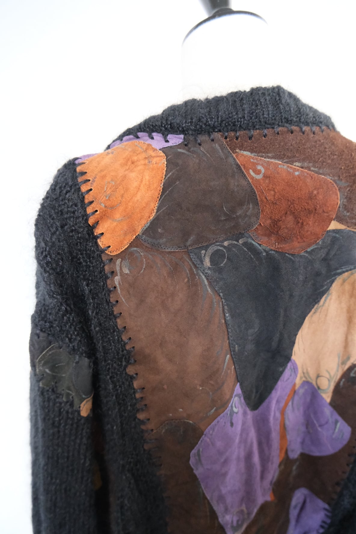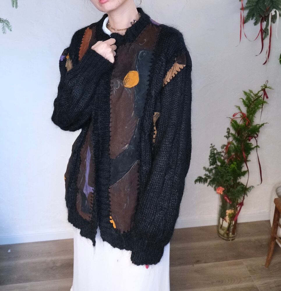 スゥエードのパッチワークの様なデザインが楽しいブラックモヘアカーディガン。