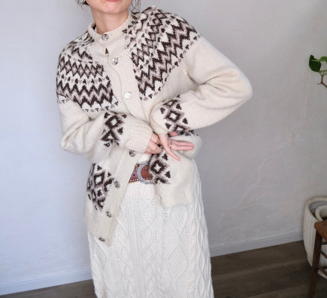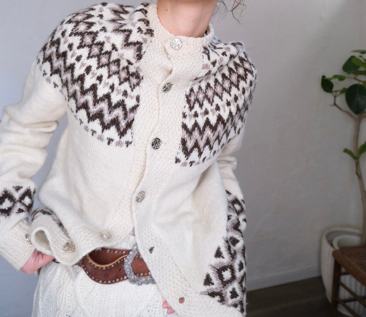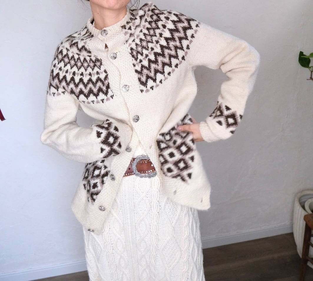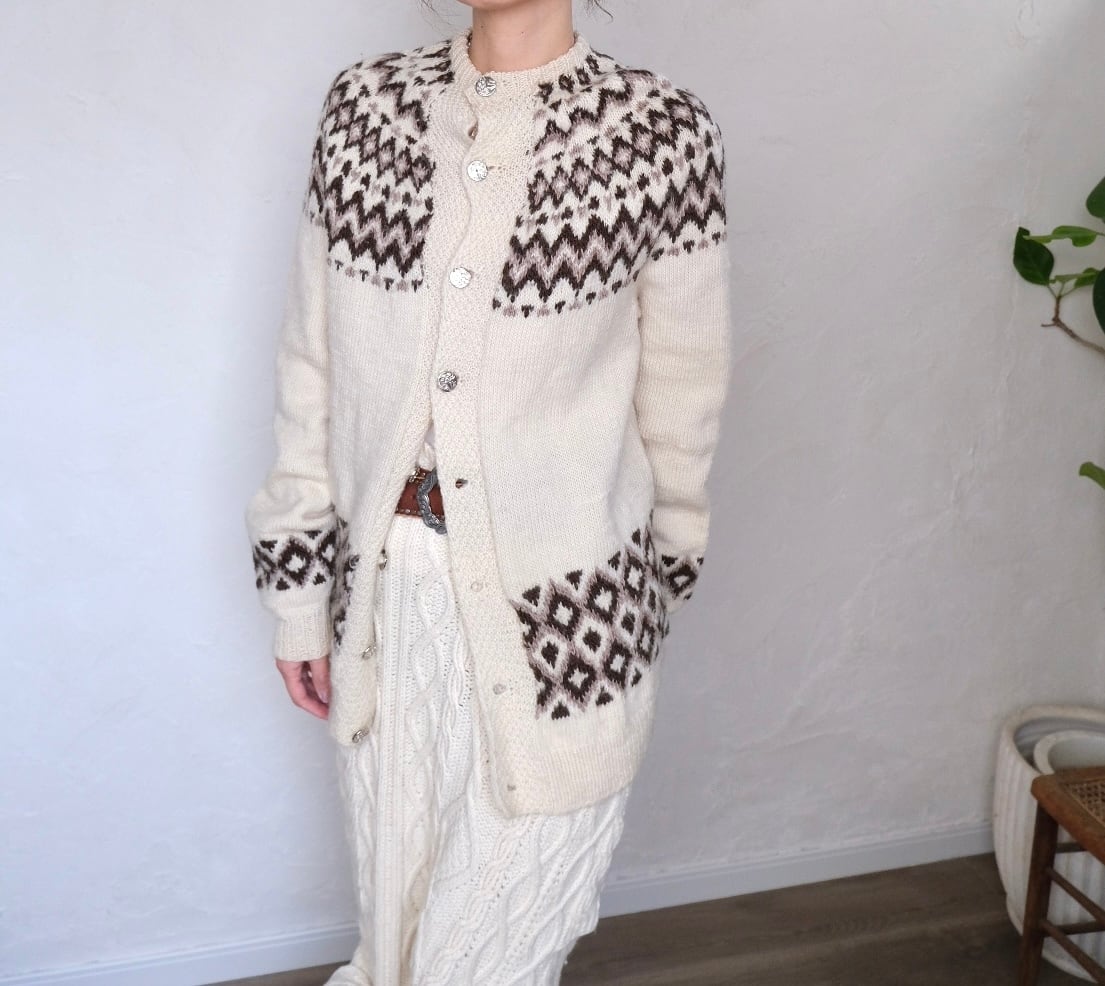ホワイトにブラウンの優しい雰囲気のノルディックカーディガン。