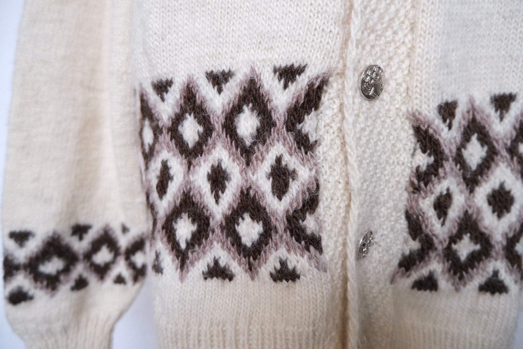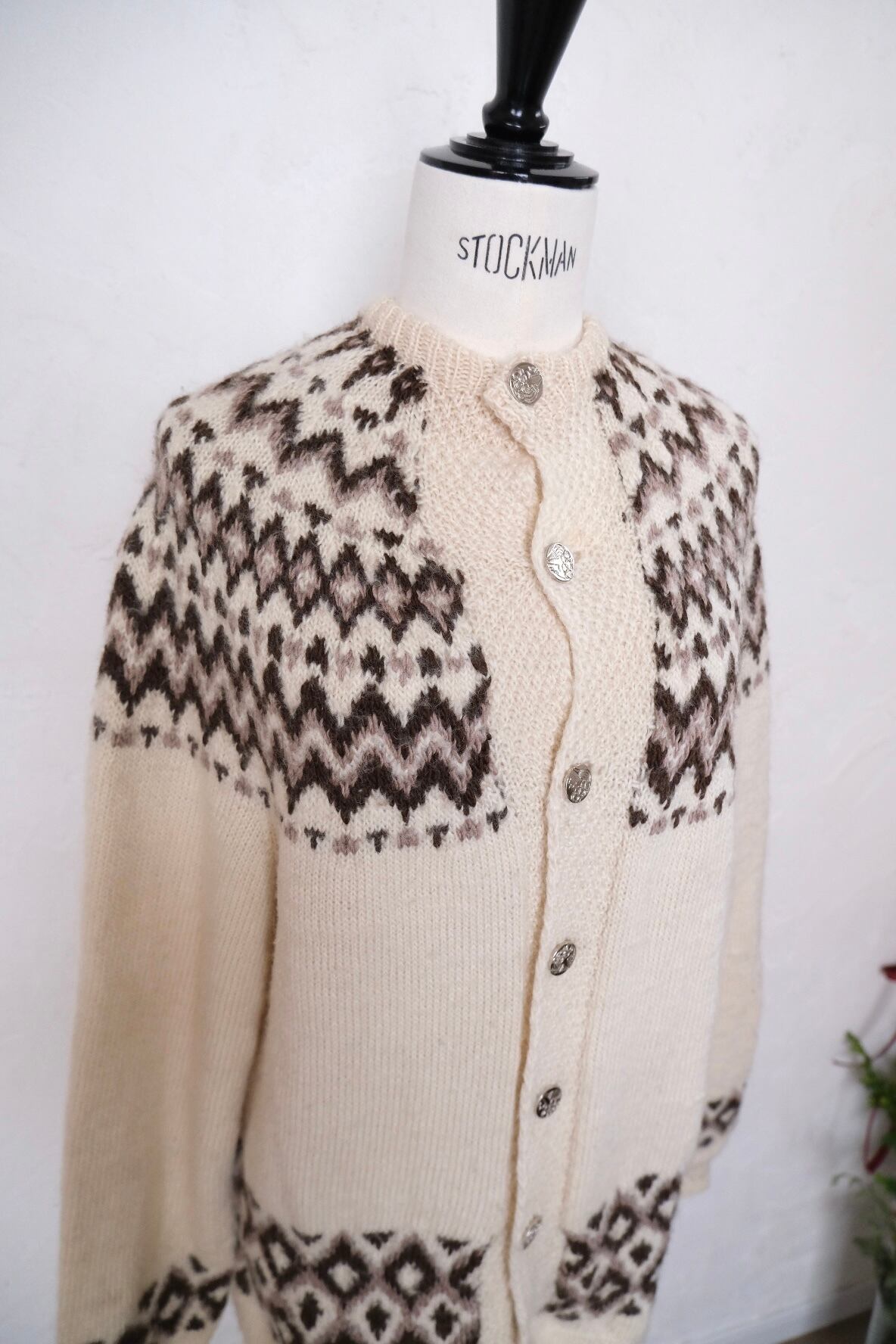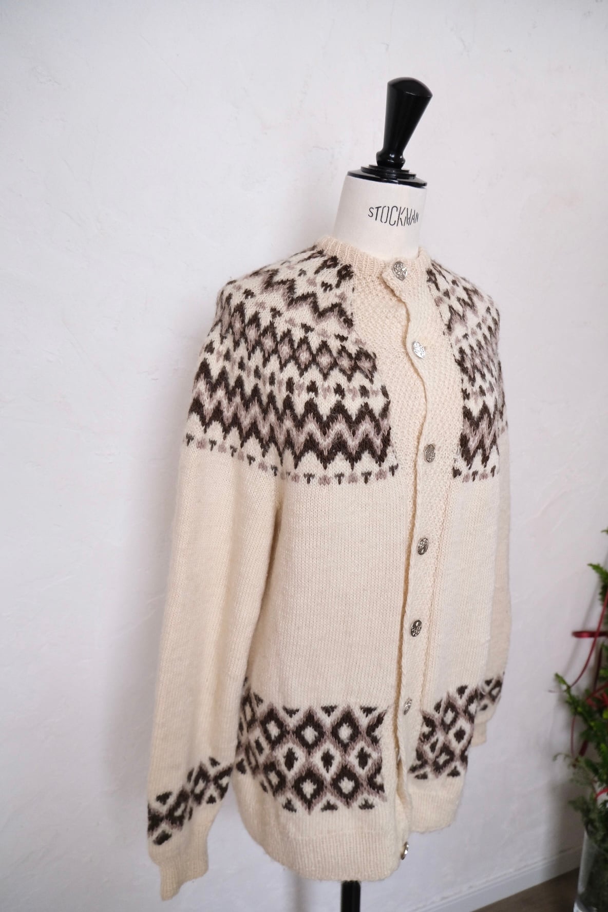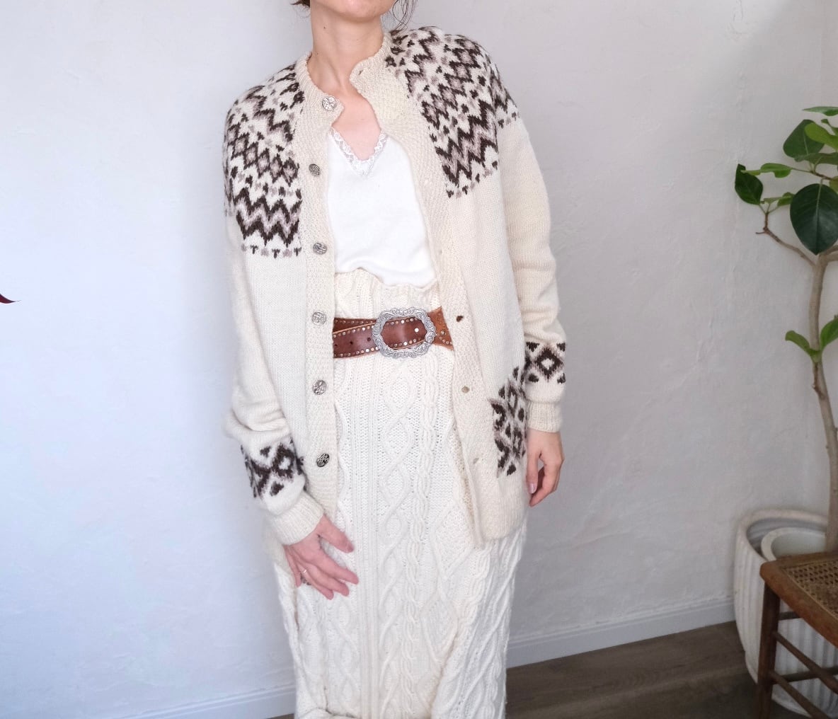 ホワイトにブラウンの優しい雰囲気のノルディックカーディガン。